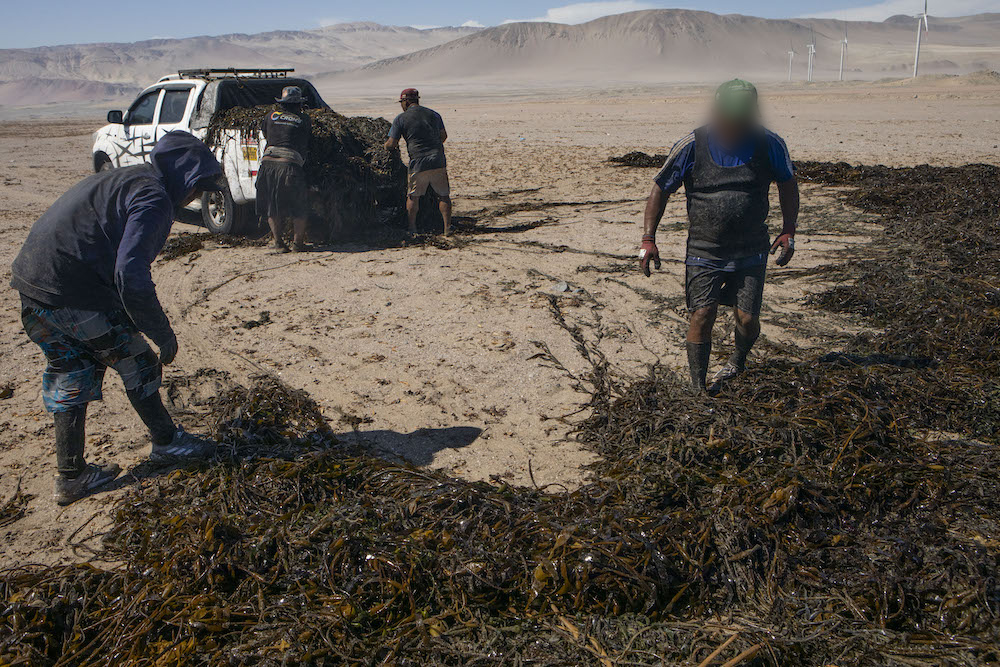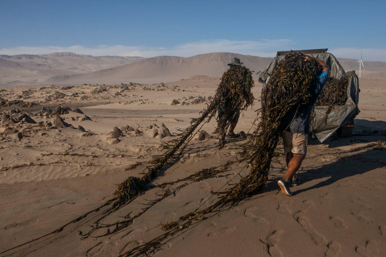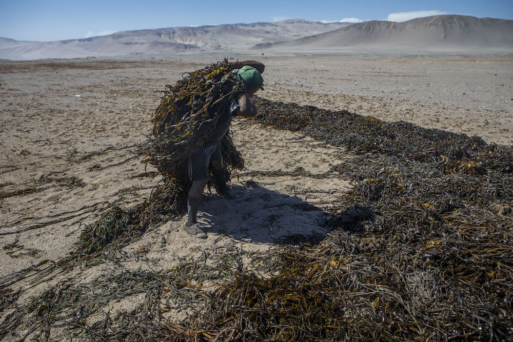 Son las siete de la mañana y el viento frío sacude las toneladas de algas que fueron tendidas en la arena para ser secadas al sol. Con sus manos curtidas, Julio César Uchuylla se acerca a ellas y forma veloz un enorme montículo, lo levanta de un tirón y se lo echa al hombro. Sin perder el ritmo, lanza la carga en la tolva de una camioneta y vuelve por más. Tiene 60 años y toda una vida entregada al mar.