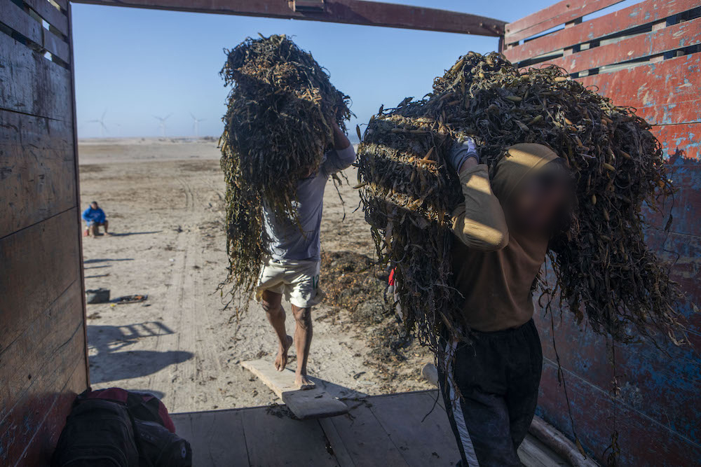 Al amanecer, camionetas y camiones irrumpen en el desierto por trochas casi invisibles que conectan la ciudad con las dunas, un recorrido de más de dos horas trazado en la arena por la costumbre. Al llegar a la playa, los choferes colocan una tabla de madera en la parte trasera del camión y, uno a uno, los pescadores suben por ella con montículos de algas sobre los hombros.