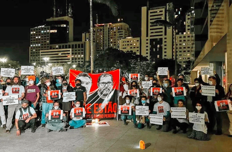 Vigilia del personal de la Fundación Nacional del Indio (Funai) cuando aún no se sabía del paradero de Bruno Pereira y Dom Phillips, asesinados en la Amazonía brasileña. Foto: cortesía @_flavia_quirino/Brasil de Fato vía Amazonia Real