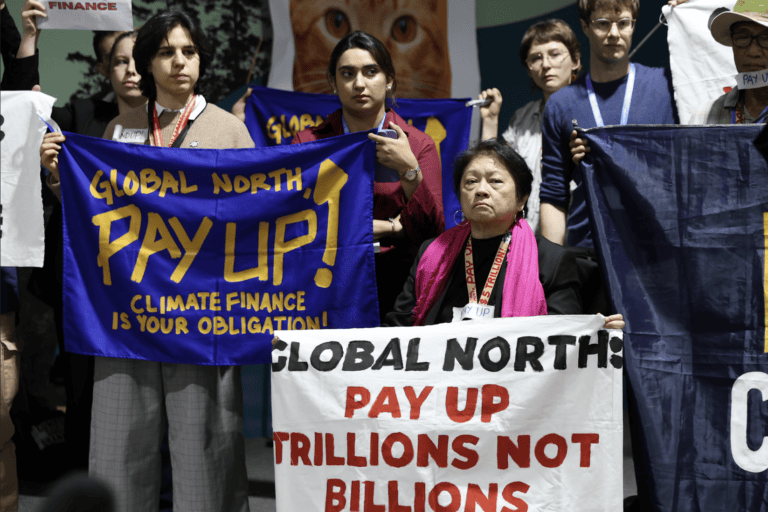 La sociedad civil pidió en la COP29 «trillions» (billones, en español) y no «billions» (miles de millones, en español) para el financiamiento climático. Foto: cortesía Kiara Worth / UN Climate Change