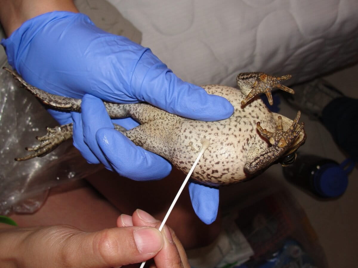 Frotis de piel para determinar la presencia del hongo patógeno Batrachochytrium dendrobatidis. Foto: cortesía Vicky Flechas