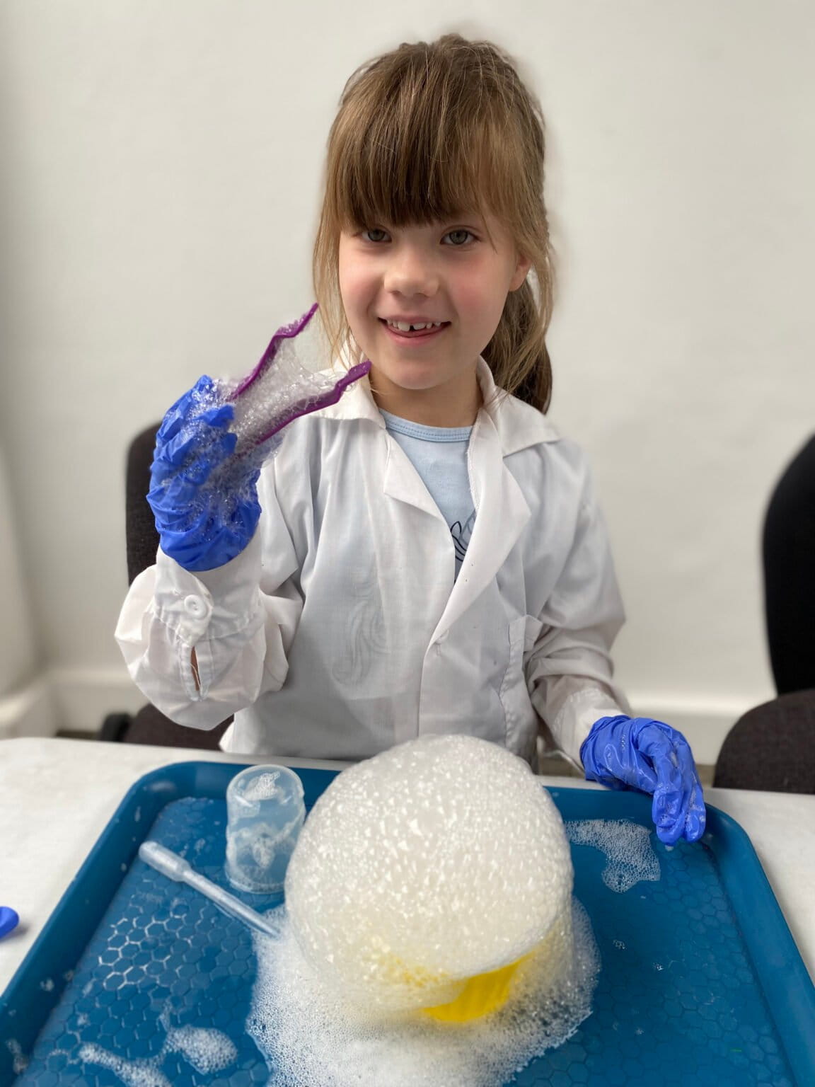 Una actividad llamada Ciencia bajo cero, donde niñas y niños exploran un fenómeno conocido como sublimación, en el que un sólido pasa a estado gaseoso. Foto: cortesía Vicky Flechas
