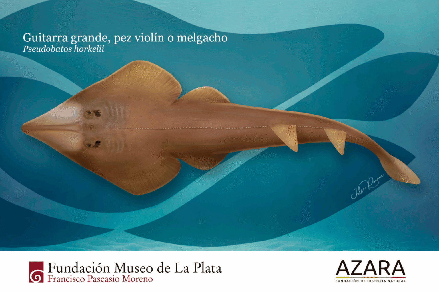 El pez guitarra —también conocido como pez violín o melgacho— es una especie costera endémica del Atlántico sudoccidental, presente desde el sur de Brasil hasta el centro de Argentina. Su silueta es muy peculiar: tiene un cuerpo plano y romboidal, hocico largo, triangular y translúcido, y una coloración que va del oliva al castaño, perfecta para camuflarse en los fondos blandos de la plataforma continental donde pasa gran parte de su vida. Allí, sobre sustratos arenosos o fangosos, se alimenta de crustáceos, moluscos, poliquetos y pequeños peces, cumpliendo su rol de depredador bentónico.